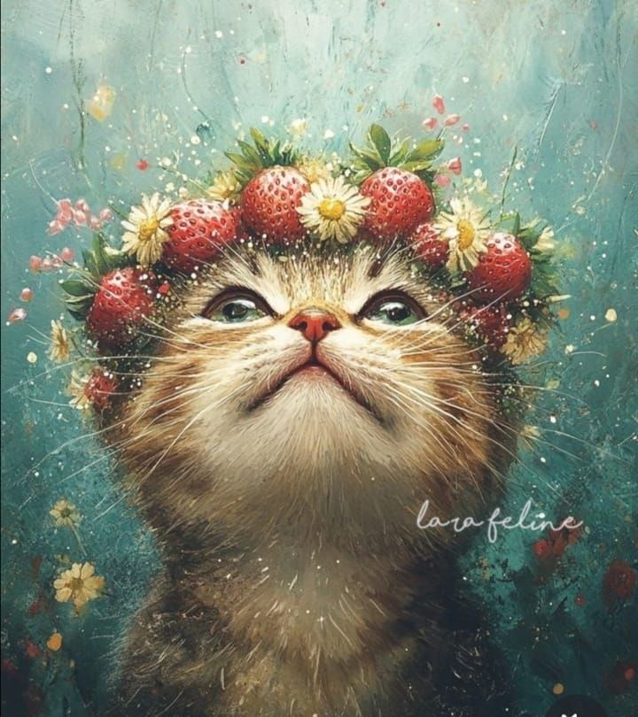 J'ai choisi ce superbe chat couronné de fraises et de pâquerettes qui lève ses yeux vers le ciel. Peut-être voit-il la Lune ?... Ce thème de la lune des fruits brûlés n'est pas si facile... Alors j'ai privilégié les fruits et les fleurs d'été.