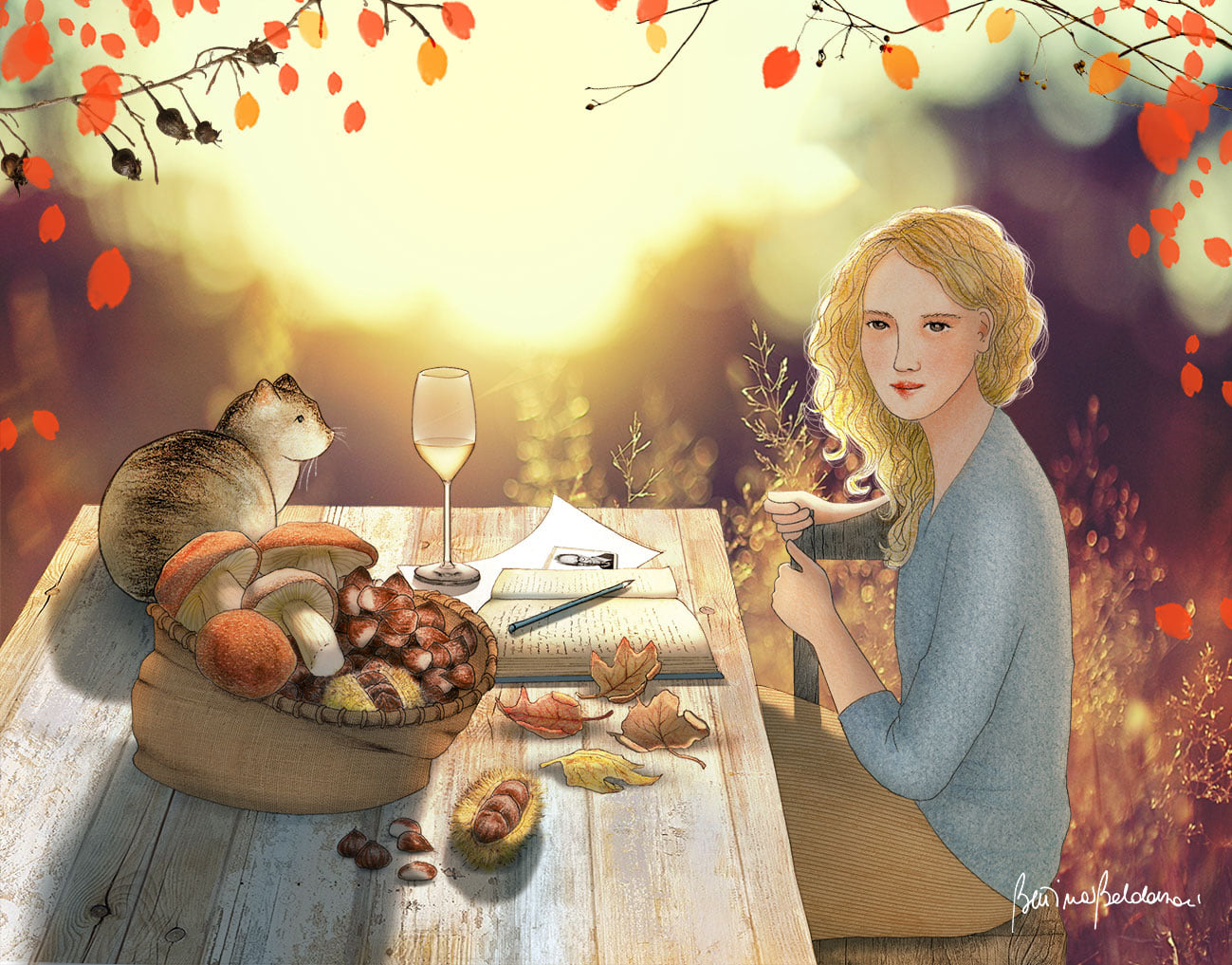 Et j'ai donc choisi à nouveau une très belle illustration réalisée à la plume et aux pastels doux par Bettina Baldassari née le 5 février 1968. Elle est italienne. Diplômée en piano et en littérature, elle est auteure de textes et de musiques et a composé des chansons. En 2007, elle a publié un pop roman et en 2010 un premier livre illustré de poésie. Ces dernières années, autodidacte, elle s'est passionnée pour l'illustration. Elle raconte des histoires sur papier blanc avec des lignes aériennes et imprévisibles de chemins, de profils dans la pénombre, des yeux qui s'échappent, des chats qui vivent dans des maisons calmes...